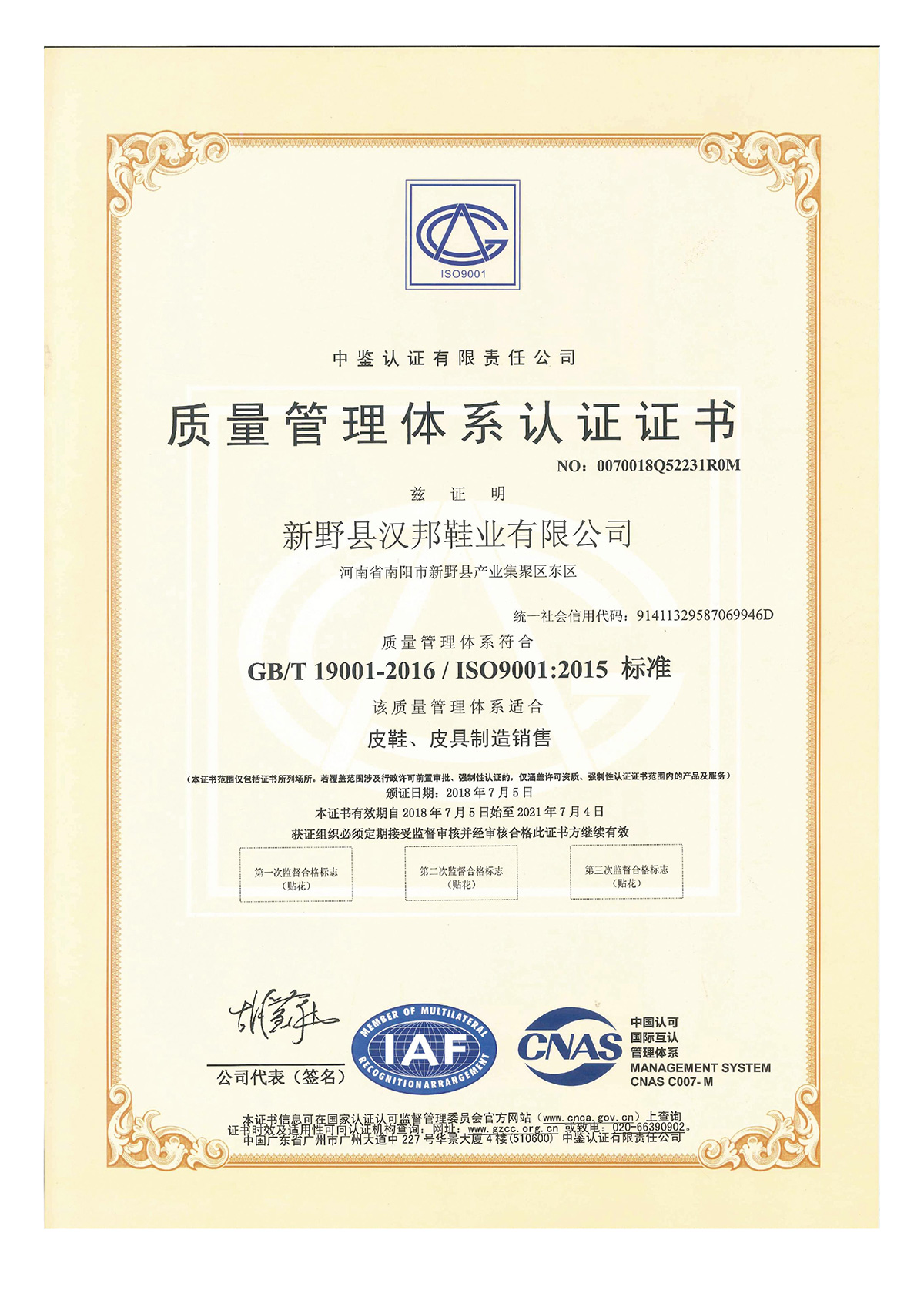 质量管理体系认证证书