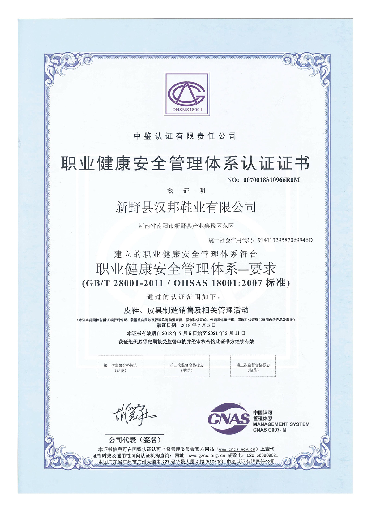 职业健康安全管理体系认证证书