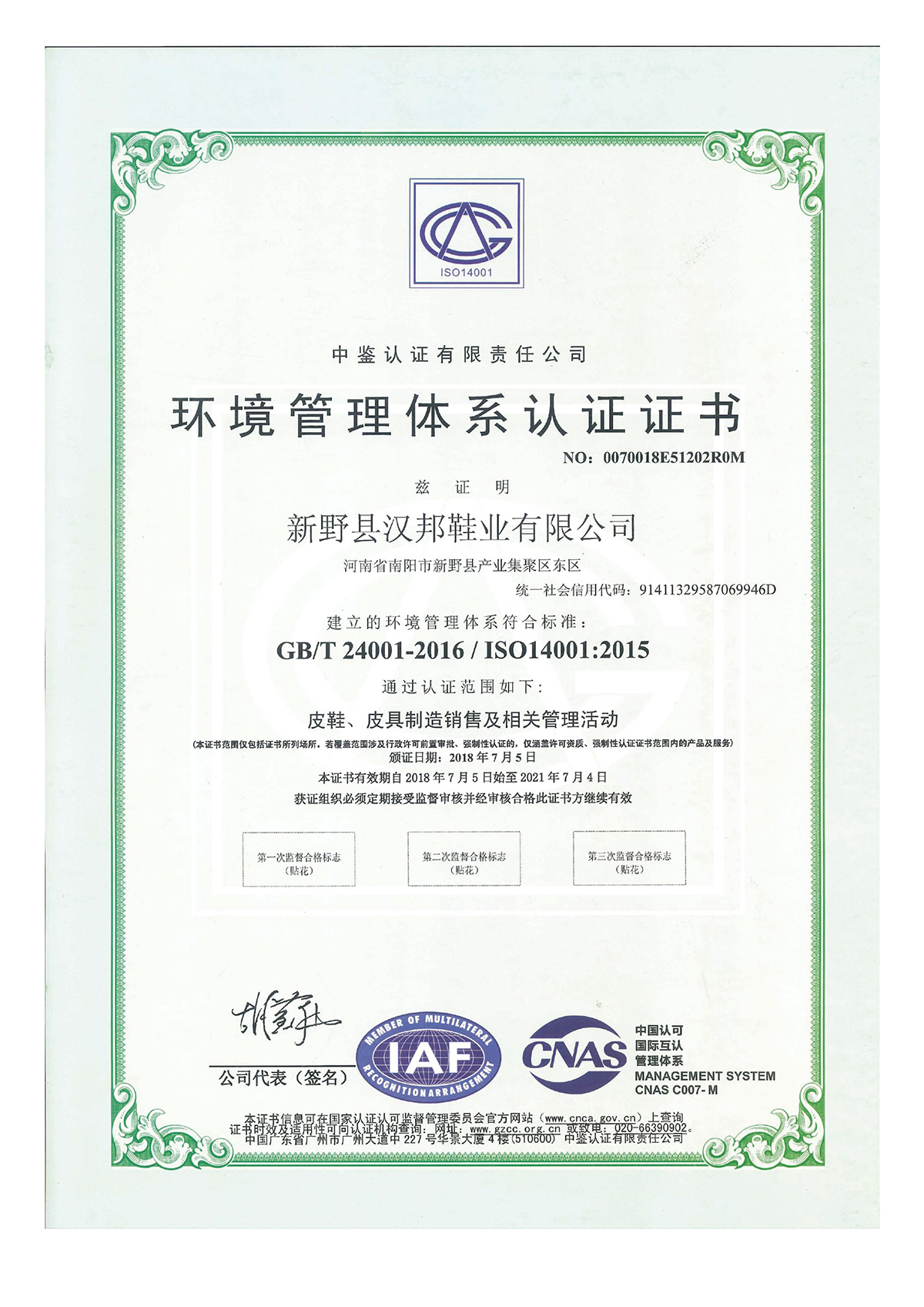 环境管理体系认证证书